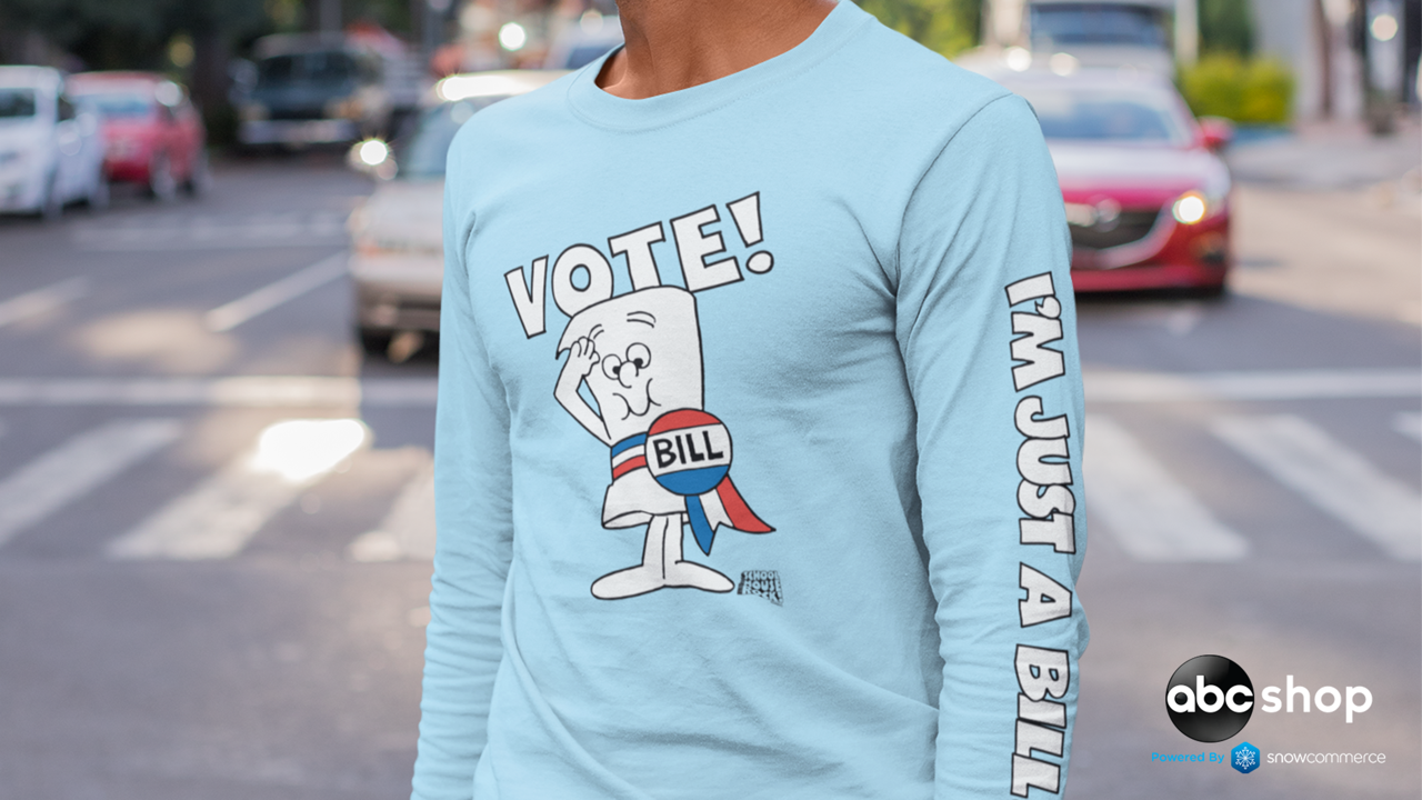 He's just a Bill, yes he's only a Bill, and he's sitting there on Capitol Hill. But he could be sitting in the top drawer of your dresser hoping and praying that you will make him part of your Election Day ensemble with this cool new T-shirt. No congressional vote needed! No veto power in play. Just head over to the ABC Shop and pick out a color for your new Schoolhouse Rock! "Vote" tee. As shown by Bill, voting is an important part of making the United States the best it can be! Whether you wear this Schoolhouse Rock! Vote Long Sleeve T-shirt to the polls or while watching Schoolhouse Rock! with your kids, this long-sleeve tee will help encourage everyone to vote.