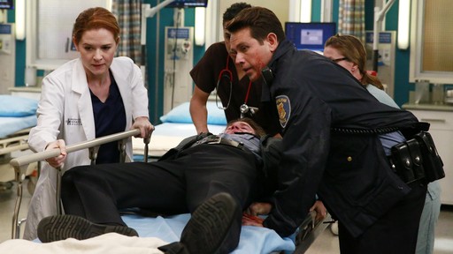 Leaving a Mark: Another heroic police officer, Dan, admits that he would have asked Callie out to dinner if they had met under normal circumstances. They’ll have to settle for a follow-up medical visit. For now, that is. Elsewhere, Jackson works to make the deceased hero cops look as good as possible for their mother at the funerals. He tells April that this is something another top doc of the past would’ve done.